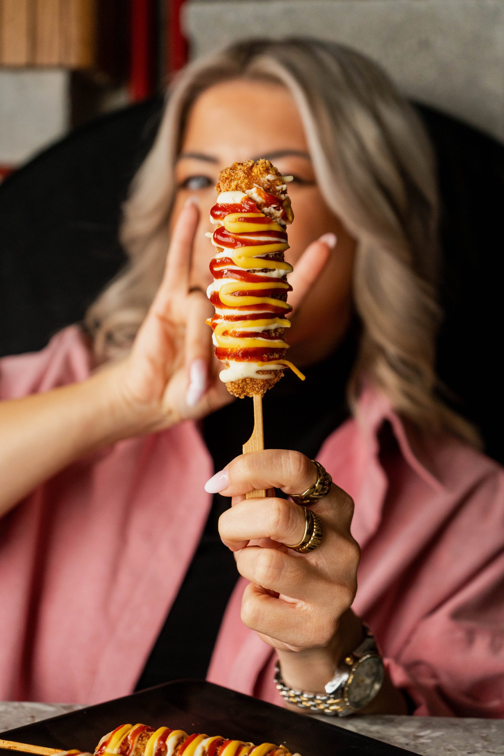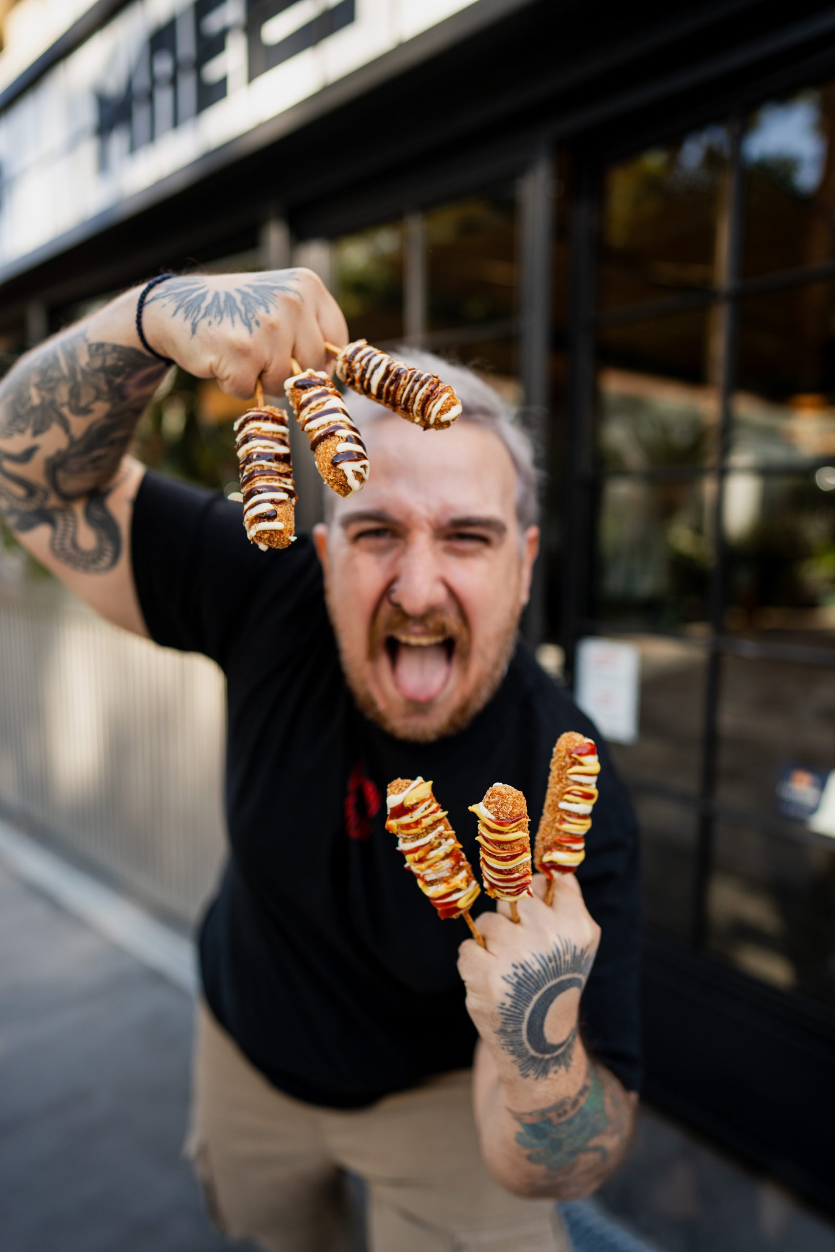CORN DOGSΤι περιέχειΛουκάνικα Φρανκφούρτης, βουτηγμένα σε χυλό και παναρισμένα σε panko. Σερβίρονται με aioli sauce, μουστάρδα και ketchup ή Μπαρ Μπεε Κιου sauce και aioli sauce.