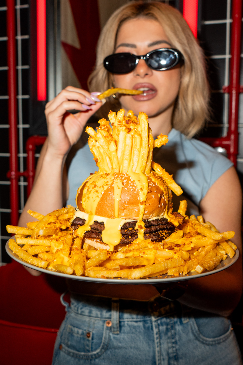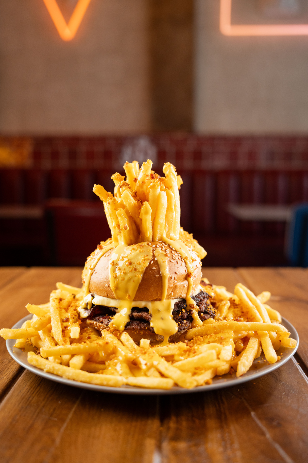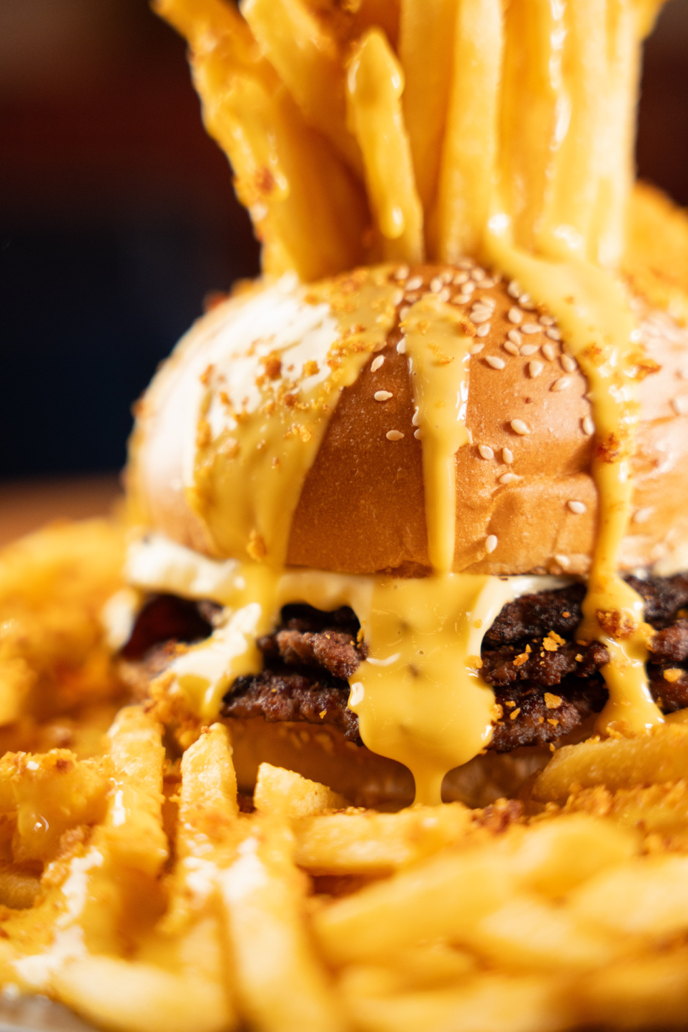 ΠΑΤΑΤΑΚΤι περιέχει 3 smashed μοσχαρίσια μπιφτέκια 2πλό cheddar 2πλό μπέικον Cheddar sauce Μαγιονέζα Τηγανητές πατάτες καρφωμένες στο ψωμάκι